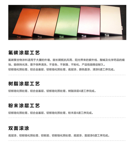 氟碳鋁單板不僅可以應用于室外裝飾還可以應用于室內墻面、天花吊頂、隔墻、包柱、包梁、陽臺、門套、窗 臺、柜臺、廣告牌,甚至屏風以及工藝品等裝飾。